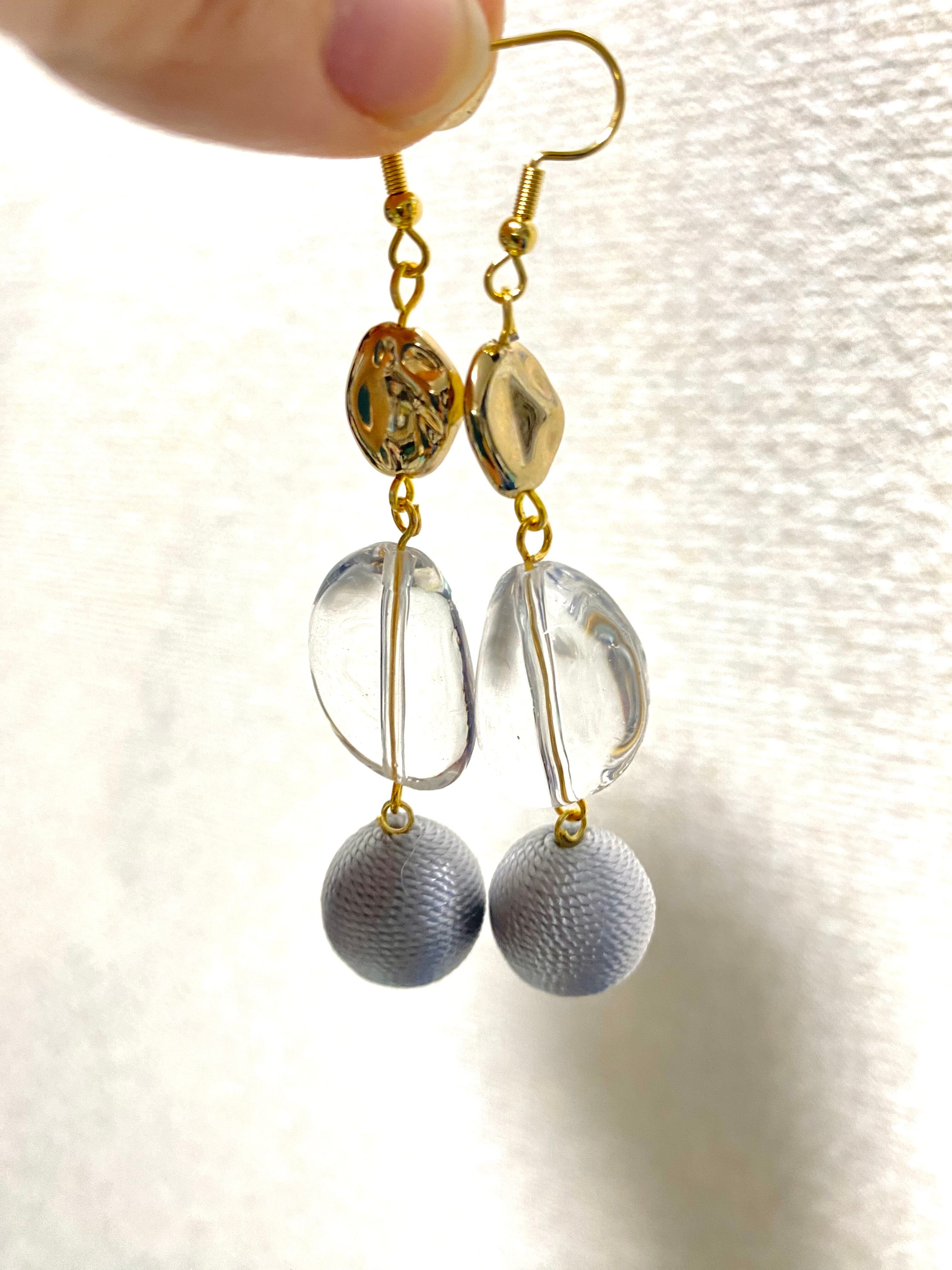 糸巻き玉と透明クリアゴールドピアス(グレー)イヤリング変更可☆耳元で揺れるアクセサリーシリーズ