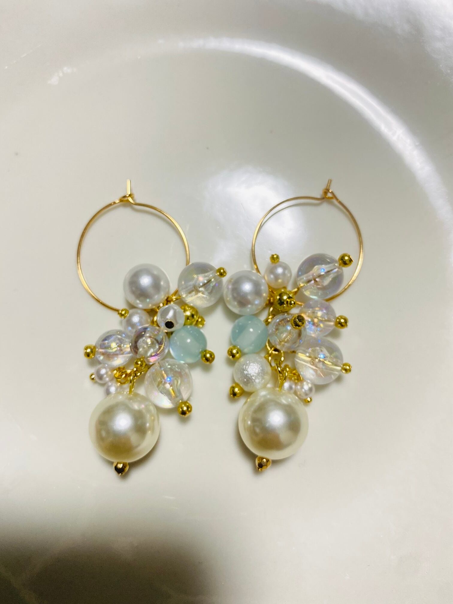 大人可愛い華やかさを演出する大ぶりパールがアクセントのオーロラピアス。